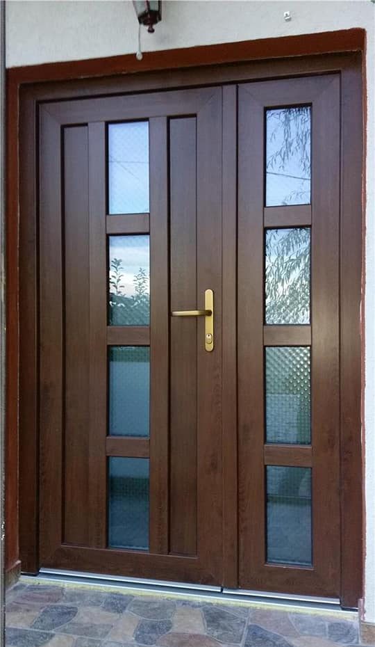 Detalii Lucrare: Montaj de ușă de intrare dublă din PVC, finisată în imitație de lemn (culoare maro închis), cu structură pe verticală.