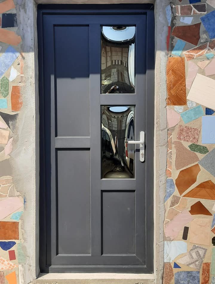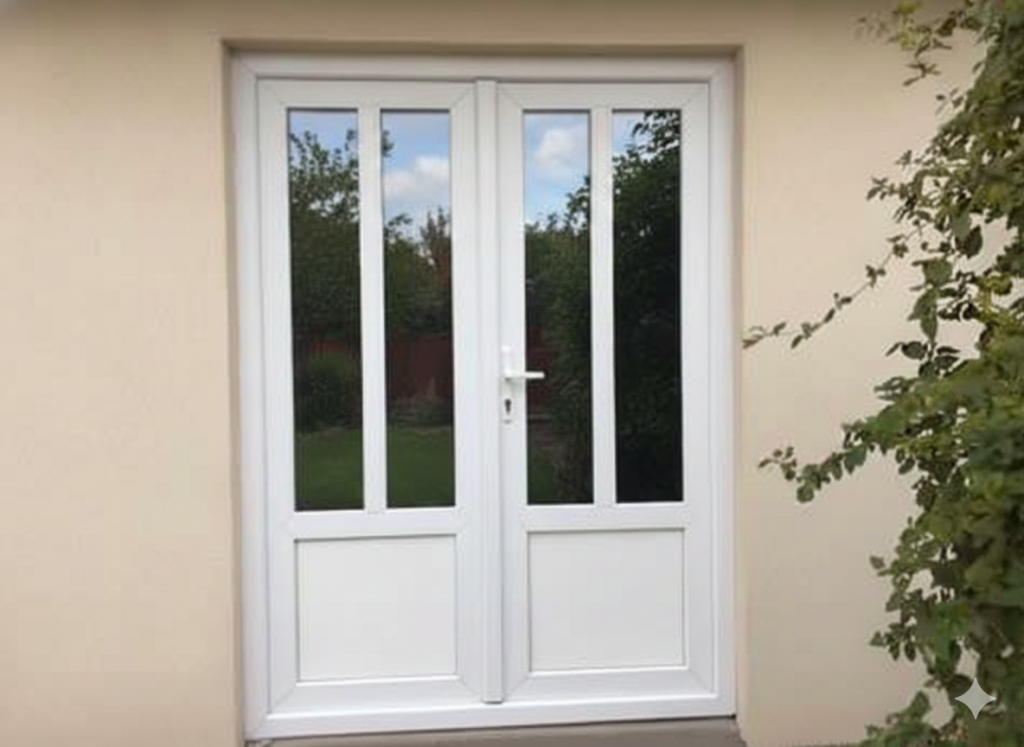 Materiale: Profil din PVC ranforsat sau metalic (termoizolant), panou central (plin) compartimentat, și două fereștrii vitrate dreptunghiulare (geam reflexiv/oglindă) pentru a permite vizibilitatea. Feronerie simplă (clanță albă).