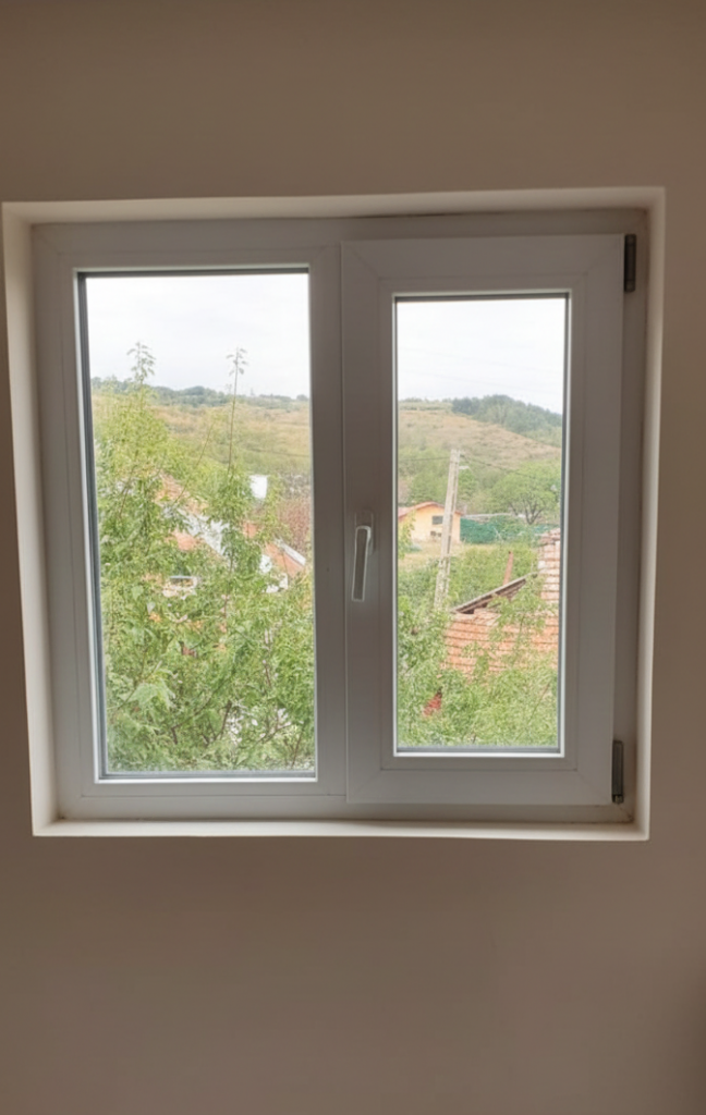 Detalii Lucrare: Fereastră din PVC cu două canaturi, profil drept și linii moderne, montată pe fațadă deschisă la culoare. Include grilaj decorativ (spros) care împarte geamul în patru secțiuni.