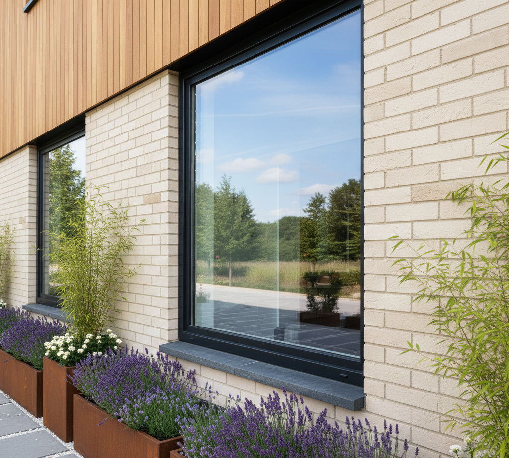 Materiale: Profil din PVC de culoare Neagră/Antracit cu sticlă clară, reflexivă (geam termoizolant sau tripan). Se integrează într-o fațadă modernă din cărămidă bej și placare din lemn.
