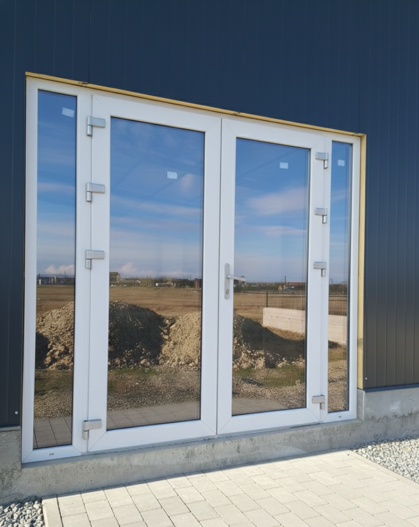 Detalii Lucrare: Montaj profesional al unui sistem de acces compus dintr-o ușă dublă (canaturi active) din PVC de culoare albă, flancată de două panouri laterale fixe (luminatoare).