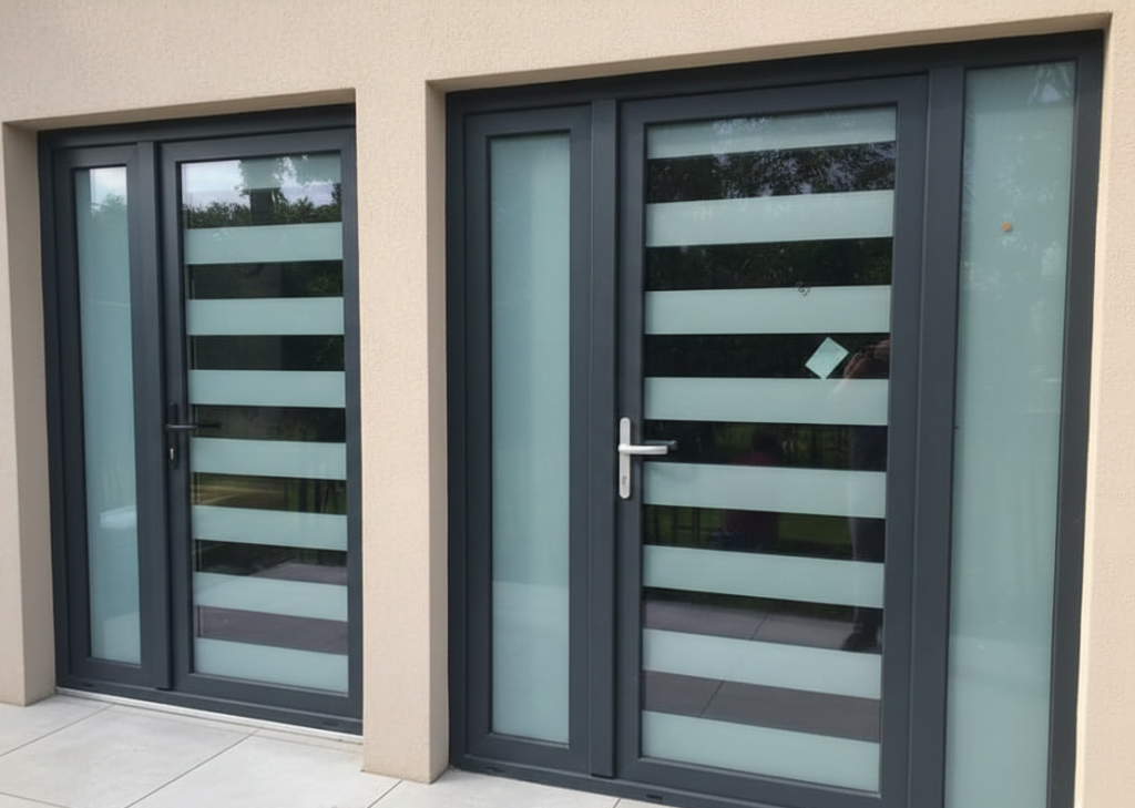 Materiale: Profil PVC ranforsat de înaltă calitate, de culoare gri antracit mat. Ușa propriu-zisă este din sticlă termoizolantă, acoperită cu o folie decorativă tip zebră (dungă/bandă) pentru intimitate. Panourile laterale sunt din sticlă mată/sablată. Feronerie metalică (clanță) de culoare argintie.